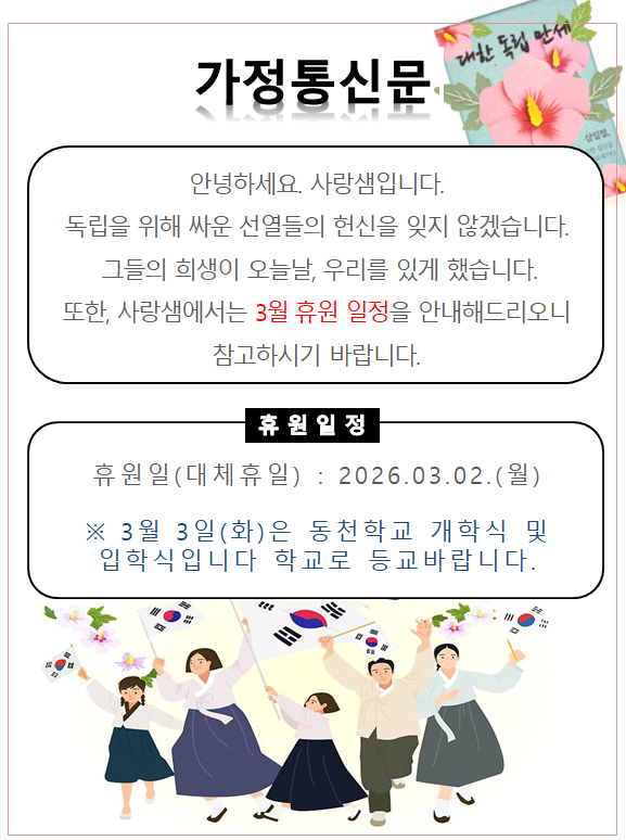 2026년 삼일절 휴원 가정통신문